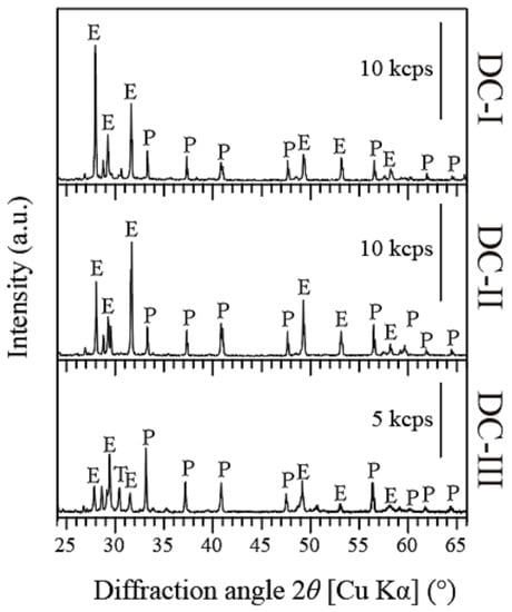 X-ray diffraction patterns of as-received DC-I, DC-II and DC-III. E: enargite (Cu3AsS4; PDF No. 00-035-0775), P: pyrite (FeS2; PDF No. 00-042-1340), T: tennantite (Cu12As4S13; PDF No. 01-074-1027).