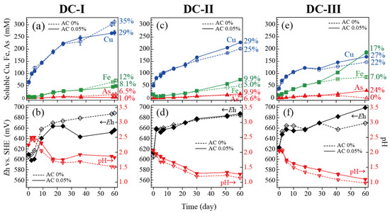 Similarly to the case of DC-I, the Eh level remained max. ~690 mV even without AC. In the case of DC-II, however, AC dosing did not further reduce Eh (Figure 3d). As a result, all parameters behaved in a rather similar way regardless of the AC dosing (Figure 3c,d). This difference between DC-I and DC-II may have arisen from the higher As content in the former, which provided harsher conditions for microbes to maintain the Eh level. The Cu dissolution was only slightly higher with AC (29%) than without AC (25%), in response to a slight difference in the Eh level between the two (Figure 3c,d). Again, only a portion of As was detected soluble (9.9% at AC 0.05%; 5.0% at AC 0%; Figure 3c,d), the rest seemingly immobilized with the leaching residue.