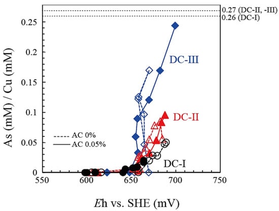 The molar ratio of [soluble As]/[soluble Cu] in the bioleached liquor as a function of Eh (vs. SHE) during bioleaching of DC-I (●, ○), DC-II (▲, △) and DC-III (◆, ◇) at AC 0% (dotted line) or at AC 0.05% (solid lines). Dotted horizontal lines indicate the theoretical As/Cu ratio upon the complete dissolution of each concentrate based on Table 1.
