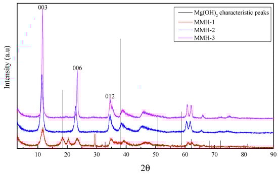 Multiple studies have shown that MMH has the crystal structure of hydrotalcite []. X-ray diffraction was conducted on the three prepared samples, as shown in Figure 1. It can be seen from Figure 1 that the characteristic peaks of the X-ray diffraction patterns of the three synthesized samples were different from the characteristic peaks of Mg(OH)2. The peak of Al(OH)3 is relatively broad, while the peaks of the three samples in the figure were very sharp, so the synthesized sample was different from Al(OH)3. Therefore, our synthesized MMH was not a separate precipitate of Mg(OH)2 and Al(OH)3, but a new substance different from Mg(OH)2 and Al(OH)3. Comparing the PDF card (89–460) of the X-ray diffraction pattern of hydrotalcite, the characteristic peaks 003, 006, and 012 of hydrotalcite appeared in all three samples.