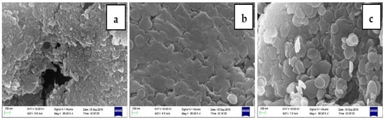Figure 2 shows SEM images of the three MMH samples, where a, b and c represent MMH-1, 2 and 3, respectively. They clearly illustrate the laminate structure and appearance of the three synthetic samples. When comparing the SEM images of the three samples, it is clear that MMH-3 had a more complete layer structure and crystallinity. As reported in Section 3.1, this result was consistent with the X-ray diffraction data.