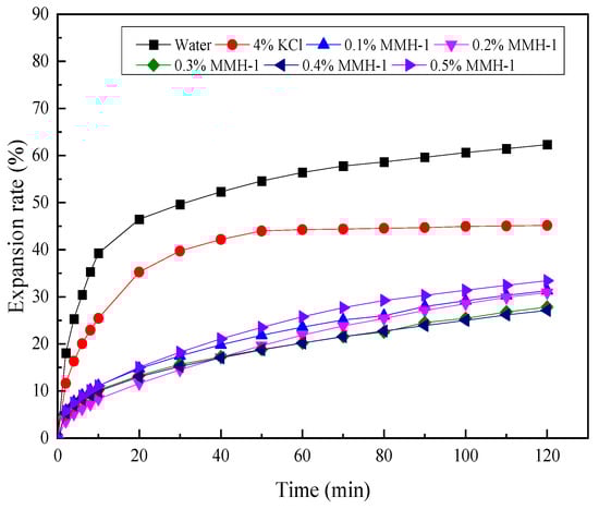 Among the different concentrations, the effect of 0.3% MMH-3, as shown in Figure 5, was the best. The expansion rate at 120 min was only 25.71%, which was significantly lower than the expansion rate at 120 min in clean water (63.21%), and the suppression effect was far greater than the 4.0% KCl solution. The experimental results show that with the increase in the ratio of Mg and Al raw materials, the inhibitory ability of synthetic samples on the hydration and swelling of bentonite gradually increases. As the concentration of MMH increases, the inhibitory ability of MMH on the hydration and swelling of bentonite increases first, and then gradually decreases.