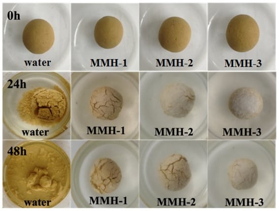 The results of the linear expansion experiment showed that MMH significantly inhibited the hydration expansion of bentonite. In the next step, the mud ball experiment was used to further evaluate their inhibitory properties. The changes in the mud ball were observed after 24 h and 48 h immersion in different MMH suspensions (0.3%). The results are shown in Figure 6.