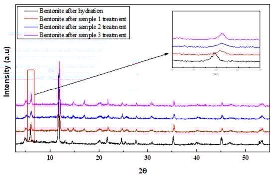 X-ray diffraction experiments were carried out on bentonite particles under different treatment conditions. From Figure 7, it is clear that the 001 characteristic peak of bentonite was 2θ = 5.9° after hydration expansion. The interlayer distance d(001) = 14.96 nm can be calculated following the Bragg equation (nλ = 2 sinθ).