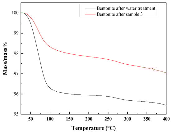 By analyzing the performance of the samples at room temperature, we concluded that the solution with the addition of 0.3% of MMH-3 achieved the best performance. In order to verify the temperature resistance of MMH-3, thermogravimetric analysis was performed on MMH-3-treated bentonite and water-treated bentonite, and the results are shown in Figure 8. As can be seen in Figure 8, the water content in the MMH-3-treated bentonite was significantly smaller than that of the tap water-treated bentonite, which further indicates that the MMH has a strong inhibitory effect on the hydration swelling and hydration dispersion of bentonite.