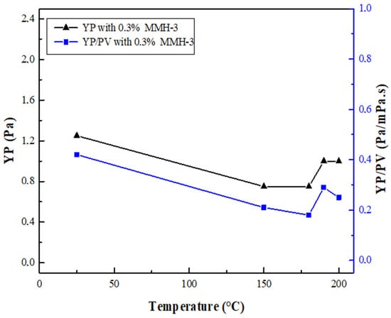 Effect of temperature on the drilling fluid YP and YP/PV with 0.3% MMH-3.