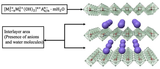 Mixed metal hydroxide (MMH) is a layered hydroxide composed of mixed metal hydroxide crystal ions with positive charges [,,]. In 1942, Feitknecht [] stated that the structure of these compounds was double-layered, with one regular triakisoctahedral layer containing divalent cations, and another regular dioctahedral layer containing trivalent cations. Compositions of chemicals can generally be described as follows: