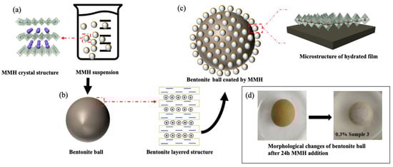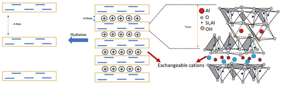 As shown in Figure 11, the expansiveness of bentonite is strongly related to the montmorillonite content. Montmorillonite is composed of a lattice of aluminum octahedrons and silicon oxygen tetrahedra. The constant negative charge of the montmorillonite layer arises due to the isomorphic replacements of Al3+ by Fe2+ or Mg2+ in octahedrons, and/or as a result of isomorphic Si4+ replacement by Al3+ in tetrahedrons []. When bentonite is dispersed in water, charged particles will form. A negative outer edge will form around the particles; this is due to the hydration film formed on the surface of the bentonite particles, caused by the electrical property. The repellent effect of hydration film disperses bentonite particles. MMH particles have a higher positive charge, while the surface of bentonite has a negative charge. Therefore, MMH adsorbs on the surface of bentonite and prevents water molecules from entering the interlayer of bentonite, as shown in Figure 12, thus inhibiting the hydration and dispersion of bentonite.