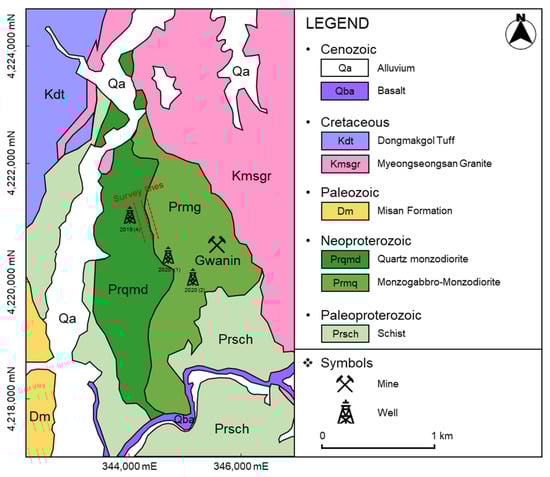 Geological map of the area surrounding the Gonamsan intrusion (modified from Kee et al. [16]). Numbers below the well symbols indicate the installation year and the number of wells. The red dashed lines represent the three parallel lines of the electrical resistivity and induced polarization survey.
