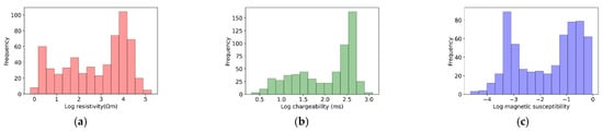 To use the geophysical properties of drilling cores as features for training, we measured the electrical resistivity, chargeability, and magnetic susceptibility of all 596 rock samples [17]. Resistivity (ρ) is a coefficient of Ohm’s law that represents the impedance of direct current and is calculated from the cross-sectional area and length of the rock. As metals generally have high electrical conductivity, i.e., low resistivity, the resistivity distribution is useful for the exploration of magnetite deposits [20]. Chargeability (mV/V) represents the overvoltage effect of induced polarization. When the current between electrical poles stops, the voltage does not immediately reach zero, and overvoltage remains for a short time due to the effect of polarization [21]. In the time domain, the chargeability can be theoretically measured as the ratio of the measured voltage to the overvoltage, but obtaining overvoltage at the moment at which the current is cut off is difficult. Therefore, the integral over a specific time period is generally used, which is known as the apparent chargeability (ms). Magnetic susceptibility (dimensionless) is a geological property defined by the ratio of magnetization of the rocks to magnetic field strength and is an important property for the exploration of magnetite, where basic and ultra-basic rocks have high magnetic susceptibility [17]. Figure 3 shows the distribution of geophysical properties using histograms of logarithmic values. It can be seen that the geophysical properties are distributed in a wide range even after log transformation, especially in electrical resistivity and magnetic susceptibility.