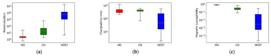 Box plots of the (a) electrical resistivity, (b) chargeability, and (c) magnetic susceptibility of rock samples classified as high-grade ore (HO), candidate ore deposit (CO), and host rocks (HOST).