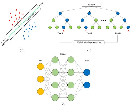 Schematic images of machine learning (ML) methods: (a) support vector machine (SVM), (b) random forest (RF), and (c) deep neural network (DNN).