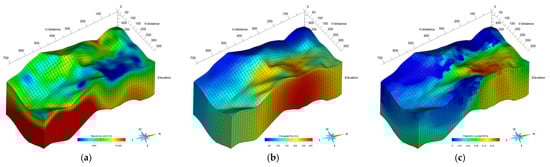 The 3D inversion results from the geophysical field survey: (a) electrical resistivity, (b) chargeability, and (c) magnetic susceptibility.