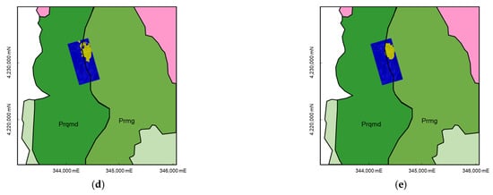 Comparison between the geological map and classification results obtained with trained ML methods: (a) SVM, (b) RF, (c) XGB, (d) LGBM and (e) DNN. The areas colored in yellow are candidates for ore deposits.