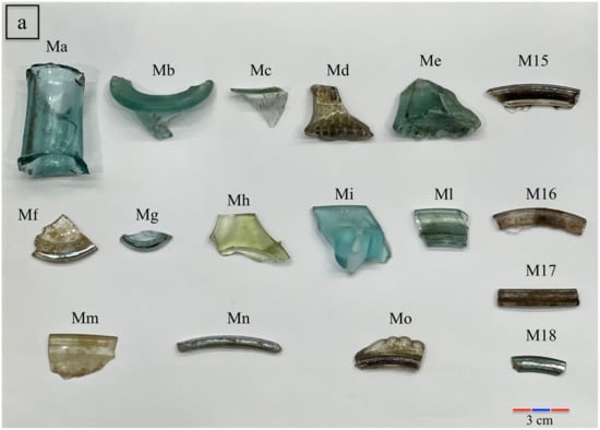 - Gliozzo, E.; Santagostino Barbone, A.; D’Acapito, F. Waste glass, vessel and window- panes from Thamusida (Morocco): Grouping natron- based blue- green and colourless Roman glasses. Archaeometry 2013, 55, 609–639. [Google Scholar] [CrossRef]