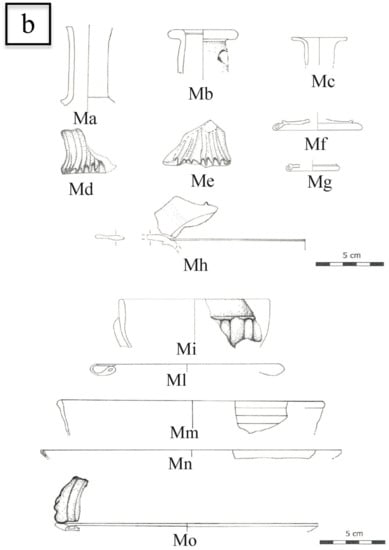 The best-preserved specimens suggested a chronology between the first and second centuries AD as bottles (samples Mb, Me, and Md) and cups (Mi, Mn, and Mo). This dating agrees with the ceramics study [24], confirming that the occupation of the Muricelle site occurred mainly in the first and second century AD.