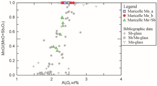 Al2O3 versus MnO/(MnO + Sb2O5) diagram. The bibliographic data refer to coeval Roman glasses [5,8,15,17,34].