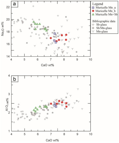 In the diagrams CaO versus Na2O and CaO versus Al2O3 (Figure 4a,b, respectively), the three Muricelle groups plotted in distinct areas. In detail, the Mn_a and Mn_b samples were richer in CaO (>7 wt%) and poorer in Na2O (from 16.29 to 17.70 wt%) than the Sb + Mn glasses which, on the contrary, showed a maximum CaO content of 6.59 wt% and Na2O varying from 18.18 to 19.72 wt%. Concerning Al2O3, all three groups showed similar concentrations (2.06–2.63 wt%).