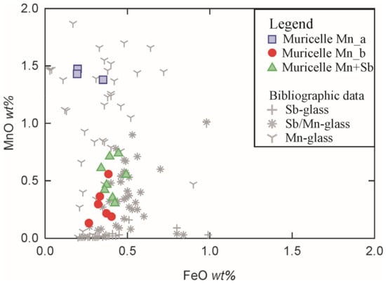 The FeO versus MnO plot (Figure 5) shows the low values of FeO (below 0.5 wt%) for all the analysed glasses, which together with the high value of SiO2 (Table 3) confirms the use of selected sands. The MnO content, as stated above, had variable values; particularly, the high concentrations (around 1.5 wt%) of MnO in the Mn_a group indicated the deliberate addition of this element as a decolouring agent [19] and the probable use of pyrolusite (MnO2), the most common manganese minerals [26], which was a very widespread technique in the Roman period to neutralize the colour due to the iron oxides naturally present in the raw materials [18,19,37]. The Mn_b and Sb + Mn groups showed similar contents of Fe, confirming that the iron content was low for all Muricelle glasses, highlighting the absence of intentional addition. On the other hand, the MnO contents > 0.025 and ≤ 1 wt% suggested the possibility of unintentional addition of this element through a recycling process [8,15,21].