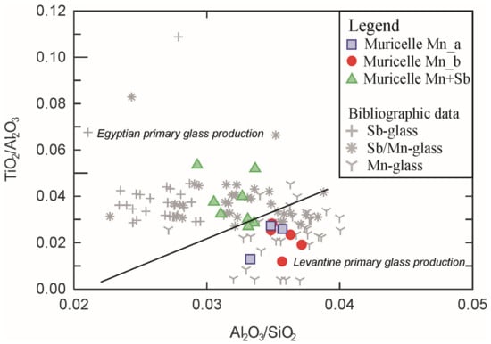 Based on the Al2O3/SiO2 and TiO2/Al2O3 ratios, Schibille et al. [10] proposed a subdivision of primary glasses into two provenances from Egypt and Levant. In detail, Schibille et al. [10] assigned to the Roman-Sb glasses an Egyptian origin and to the Roman-Mn glasses a Levantine coast origin. The Mn_a and the Mn_b Muricelle glasses were produced mainly using Levantine sands; on the other hand, for the glasses from the Sb + Mn group, it is more complicated to define the raw materials provenance because they are recycled and therefore represent a mixture of the two end members (i.e., Sb and Mn colourless glass).