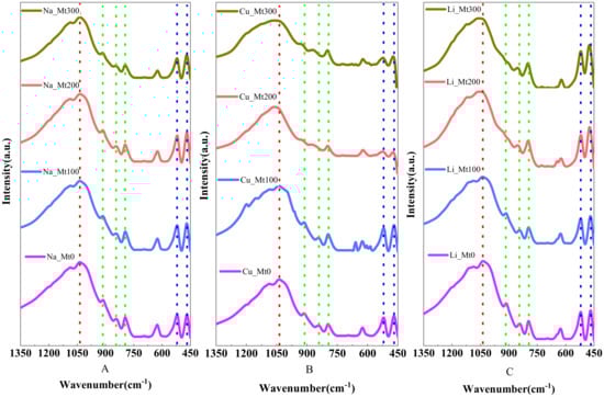 The Si-O stretching vibration peaks of Na-Mt0, Cu-Mt0 and Li-Mt0 were all located near 1035 cm−1 (Figure 3). After heating, the Si-O stretching vibration of the Na-Mt series hardly changed (Figure 3A). Compared with Cu-Mt0, the Si-O band of Cu-Mt100 had no movement; when heated to 200 °C, the Si-O peak value moved from 1035 cm−1 to 1049 cm−1; when heated to 200 °C, the Si-O band widened and the peak moved to 1050 cm−1 (Figure 3B). During the heating process of montmorillonite, the change trend of Li-Mt and Cu-Mt was similar. The Si-O stretching vibration band of Li-Mt100 was located near 1037 cm−1 and its movement could be ignored (Figure 3C). The vibration peaks of Li-Mt200 and Li-Mt300 were 1051 cm−1 and 1053 cm−1, respectively. During the heating process, the structure of montmorillonite became similar to pyrophyllite due to the migration of interlayer Cu2+ and Li+ (the Si-O stretching vibration peak of pyrophyllite was near 1049 cm−1) [].