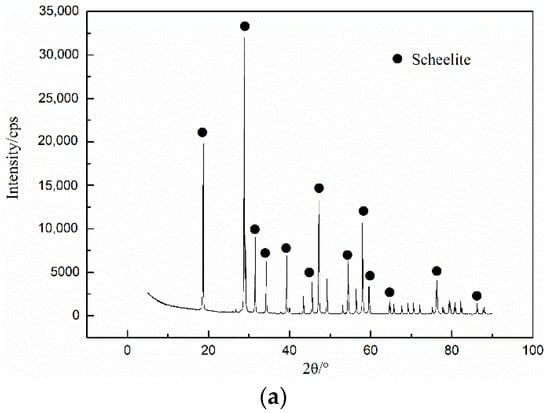 Tungsten, a rare metal, is important for its strategic position and industrial applications [1,2]. Scheelite (CaWO4) and wolframite [(Mn, Fe)WO4] are two major tungsten-containing minerals which have important development value. As wolframite has the characteristic of easy processing, which has led to its depletion, the exploitation of scheelite has become important [3,4]. Usually, the flotation method is used to separate scheelite and gangue minerals. However, there is a kind of scheelite associated with calcium-containing minerals, such as calcite and fluorite, which is difficult to separate out by flotation, because the Ca ions contained in the mineral lattices cause scheelite to have similar surface properties and floatability to the gangue minerals [5,6,7].