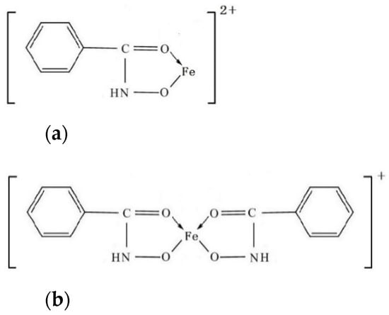 Conventionally, the Petrov process is applied to separate scheelite from other calcium minerals, which requires steaming of bulk concentrate in 2–4% solutions of sodium silicate (Na2SiO3) at 80–90 °C using fatty acids as the collectors [3,8]. However, the energy consumption caused by the high temperature and the difficulty of tailing settlement caused by sodium silicate have led people to research new high-efficiency flotation reagents [9,10]. Many researchers have conducted a great deal of work, such as depressant development, mixed-collector use, and selective collector exploiting to separate scheelite from the calcium-containing minerals [11,12]. Among this work, the development of a highly efficient collector is challenging and meaningful as it could make the flotation process clean and convenient. Up to now, fatty acid, such as oleic acid, linoleic acid, palmitic acid, and sodium oleate, which are well known for their strong collection and poor selectivity, remain the most commonly used collectors of scheelite [3,8,13]. Some scholars have found the selectivity of cationic collectors to scheelite flotation may be better than traditional anionic collectors [8], and the cationic/anionic mixed collectors can achieve better results [14]. However, these collectors still reveal the disadvantages of poor selectivity and water solubility, which need to be further studied [15]. Benzo hydroxamic acid (BHA) is recognized to have good selectivity for tungsten minerals; however, Pb(NO3)2, which pollutes the environment, still needs to be added to improve the flotation [16,17]. Han et al. developed a new high-efficiency collector Pb-BHA, applied to scheelite flotation and achieved satisfactory flotation results [18,19]. Nevertheless, only a few types of ores were suitable for separation with this reagent, and more new and efficient agents need to be developed [20]. Tian et al. [21] used Fe3+ as the activator of cassiterite with BHA as the collector, and Chen et al. [22] applied Fe-BHA to ilmenite flotation and established the adsorption model of one of the configuration forms of Fe-BHA on the ilmenite surface. However, the application of the Fe-BHA in scheelite flotation was not mentioned, and the structural forms of the Fe-BHA chelates as well as their forms in pulp still need to be further studied.