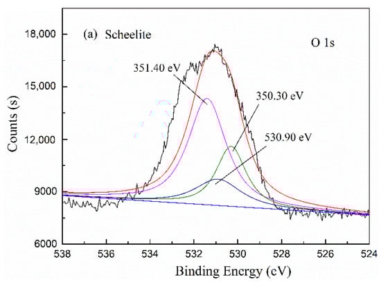 As can be seen from Figure 8, the double peaks of Ca 2p of scheelite corresponded to the peaks at 346.72 eV and 350.25 eV in the figure, respectively. After the interaction with the Fe-BHA chelates, the position of the Ca 2p peak of scheelite moved from the binding energy of 346.72 eV and 350.25 eV to the binding energy of 346.56 eV and 350.10 eV, with a small displacement of 0.16 eV and 0.15 eV, which can be considered an analytical error. Figure 9a shows that the peak at the binding energy of 531.40 eV corresponded to the peak of the O element in Ca-OH formed by the combination of Ca2+ exposed on the scheelite surface and OH- in water [25]. The peaks at the binding energy of 530.90 eV and 530.30 eV for the O element belonged to W-O− [26] and O-Ca- [27] on the scheelite surface, respectively. In Figure 9b, after scheelite contacted with the Fe-BHA chelates, the intensity of the O 1s peak was enhanced as a whole, and the peaks of the O elements in Ca-OH, W-O-, and O-Ca- shifted. Among them, the O element in O-Ca- was least affected, because it resides in the mineral crystal, so the change in the binding energy of the O element in O-Ca- was also the smallest, from 530.30 eV to 529.80 eV, a decrease of 0.50 eV. The change in peak binding energy of the O element in W-O- was also small, from 530.90 eV to 530.20 eV, which was 0.70 eV lower. The binding energy of the O element in Ca-OH changed the most, from 531.40 eV to 530.20 eV, a decrease of 1.20 eV. A new peak appeared at the binding energy of 531.1 eV. Judging from the peak shape and peak position [28,29,30], it was most likely the spectral peak of the O element in Ca-O-Fe after the scheelite surface is adsorbed by the Fe-BHA chelates. The adsorption mechanism of the Fe-BHA chelates on scheelite surface is speculated to be that an H2O is removed from the Fe-OH of the Fe-BHA and Ca-OH from the scheelite to form Fe-O-Ca.