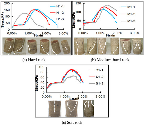 Based on the above ratios of similar-simulation materials, standard cylindrical specimens with different ratios were prepared for the compressive strength test, including three groups of the hard rock group (H group), three groups of the medium-hard rock group (M group), and three groups of the soft rock group (S group). The specimens prepared in the same batch were in a group. To reduce the influence of human error caused by preparation, three batches of specimens with different ratios were prepared, respectively. These specimens were numbered 1-1, 1-2, and 1-3 (as shown in the figure). The standard cylinder specimen was prepared by the steel two-lobe mold and a uniaxial compression test was carried out on the universal servo testing machine. The complete stress–strain curve and failure characteristics were obtained, as shown in Figure 2.