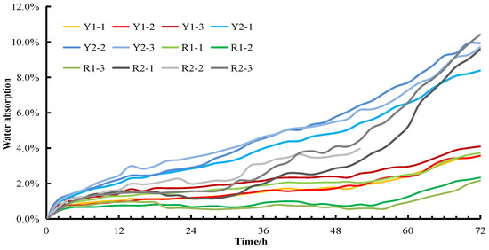 For the specimen number, H indicates the hard rock group, S represents the soft rock group, 1-x represents the rock specimen without straw powder, and 2-x represents the rock specimen with straw powder. The overall curve of the water storage rate in all rock groups during 72 h of immersion is shown in Figure 4.