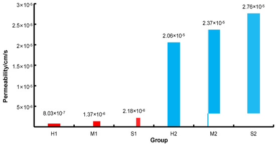 PVA is a kind of thermoplastic material dissolved in water. The prefabricated fracture entity can be formed by 3D printing. The specimen with a PVA content of 2% was used as a control group and then a variable head permeability test was conducted. The rock specimens with PVA material in different groups were numbered H1, M1, and S1, and the rock specimens without PVA material were numbered H2, M2, and S2. The permeability test results are shown in Figure 9.