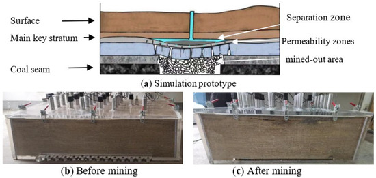 China is the main country of coal energy production and consumption [1], and coal mining brings many problems to the environment [2]. For example, underground coal mining activities can lead to ground subsidence [3,4] and the failure of the upper critical layer can lead to mining-induced fissures [5], which can cause serious problems such as damage to surface structures. Therefore, it is necessary to maintain a balance between mining and environmental protection [6,7]. As an efficient method in green mining, the mining-induced overburden bed separation grouting technique [8] can effectively reduce subsidence by the high-pressure grouting and filling into the bed separation during mining [9]. The key to its success lies in the reduction of mining subsidence by the support of the compacted ash body [10] formed by slurry bleeding and consolidation [11] in the filling layer [12]. Physical similarity simulation has been commonly used in the research of bed separation grouting. At present, transparency and visualization are the main development directions of similar-simulation materials [13] and the simulation method is the research focus. However, it is difficult to simulate the similarity of bed separation grouting.