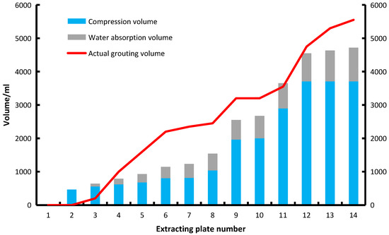 In the process of simulated mining, the initial bed separation increased continuously and grouting began after grouting conditions were met. After the grout was injected into the bed separation, the water loss consolidation occurred under pressure and the compacted ash was formed. The water secreted by the grout was infiltrated into the similarly simulated rock strata. As shown in Figure 11, when the plate with the serial number 3 was extracted, the stopping distance accounted for 28% of the total length and the volume of injected slurry (1000 mL) was larger than that of the pressed solid (623 mL), indicating that the water in the slurry was secreted and infiltrated into the rock stratum.