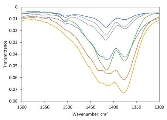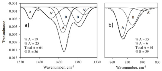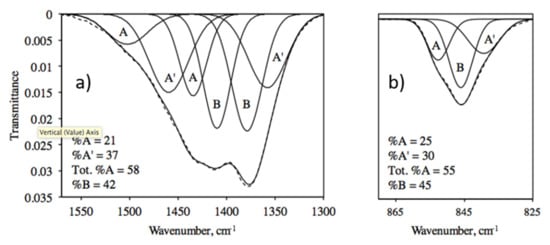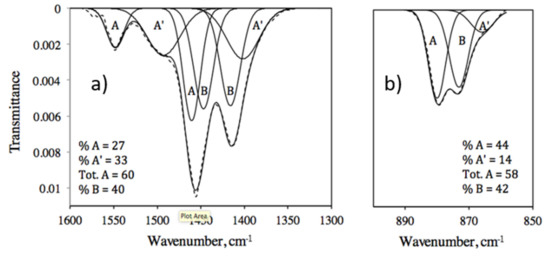 The IR spectrum of carbonate ion also has a distinctive out-of-plane bending (ν2) region at about 860–885 cm−1, which is also indicative of the different types of carbonate ions [,] and each structurally and environmentally different carbonate ion gives rise to only one peak in this region