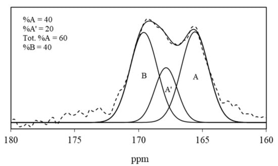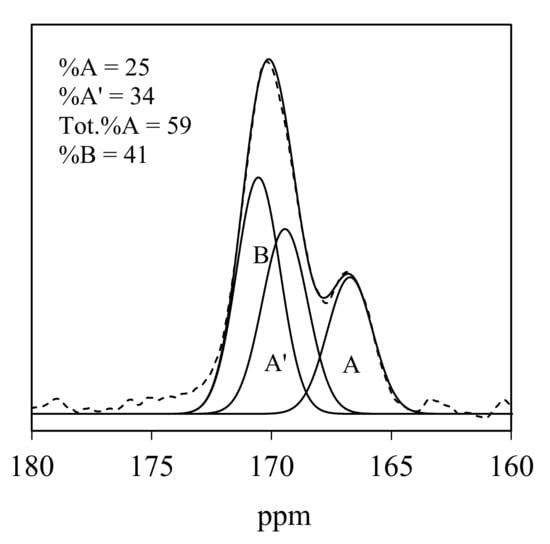 The 13C NMR spectrum of KS-87 (Figure 4) contains two peaks, one at 165.6 ppm, and the other at 169.6 ppm. The higher frequency peak is considerably broader and, as shown in the deconvolution, consists of both the A’ and B peaks. The assignments of the A and B peaks are consistent with previous work [,]. The agreement of the percentage of A-type carbonate as obtained from the IR analysis (39%) with that from the NMR analysis (40%) is good. The distribution percentages among the A-, A’-, and B-type carbonate were obtained from the areas under the peaks, assuming that the extinction coefficients are the same for each type of carbonate []). All spectroscopic data are given in Table 4.