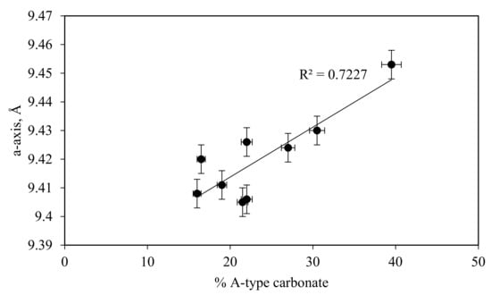 The correlation between the a-axial lengths of the unit cells of the apatites in Table 4 with the spectroscopically-determined percentage of A-type carbonate.