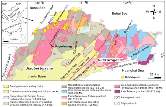 Geological map of the Jiaodong gold province showing the distribution of major fault zones, formations, intrusions, and gold deposits (modified from [36]).