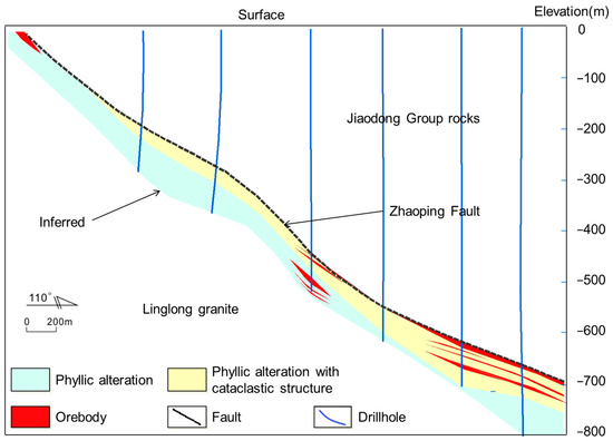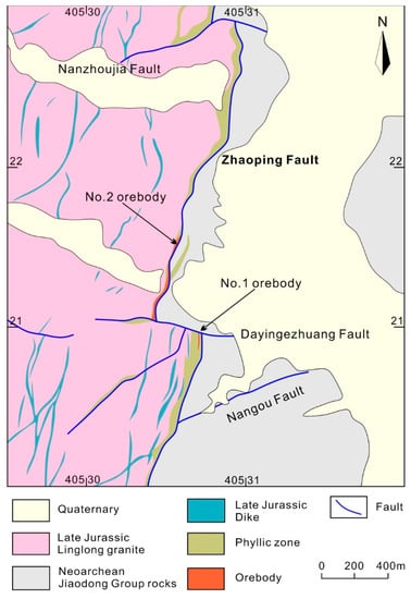 The Dayingezhuang gold deposit is located in the northwest Jiaodong Peninsula [13,35]. The ore-controlling Zhaoping fault zone in Dayingezhuang strikes SW–NE with a dip ranging from 30° to 60° (Figure 2). The Zhaoping fault is offset by about 260–300 m at the surface by the E–W trending Dayingezhuang sinistral-slip fault. The formations at Dayingezhuang are dominated by Archean Jiaodong group metamorphic rocks and Quaternary rocks distributed in the east. The Jurassic Linglong granite and minor NE–NNE-striking dikes occur in the west of the Zhaoping fault. The Dayingezhuang gold deposit displays successive alteration zonation patterns from the center (orebody) outward (Figure 3) [11]. Gold mineralization mainly occurs in the cataclastic rocks with intense microfractures in the footwall of the Zhaoping fault [35]. The gold mineralization zone extends 700–900 m along the dip direction, with varying thicknesses ranging from 2 to 30 m. Two major orebodies (No. 1 and No. 2) are located in the south and north of the Dayingezhuang fault, respectively (Figure 2).