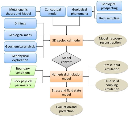 Three-dimensional geological modeling approaches reported in [37,60] were used in this study for model construction. Most geoscientific numerical simulations include conceptual, mathematical, and simulation modeling [31,33,61,62,63]. This study improved the workflow, and the detailed workflow of the numerical simulation is shown in Figure 4. Firstly, the data of geological exploration were collected and digitized based on summarizing the existing metallogenic regularities of the study area. Because the Zhaoping main fault zone was offset by the Dayingezhuang fault, the Zhaoping fault zone was reconstructed before numerical modeling. The thickness of the fault zone was 50 m, and the Zhaoping fault interface was joined together by the way of node displacement to restore the geometric structure of the fault in the ore-forming period. The solid model of the geological unit was built up based on the closed surface model. Finally, the solid model data format was converted into a tetrahedral grid model data format and imported into FLAC3D software for numerical simulation. The detailed workflow of numerical simulation is shown in Figure 4.