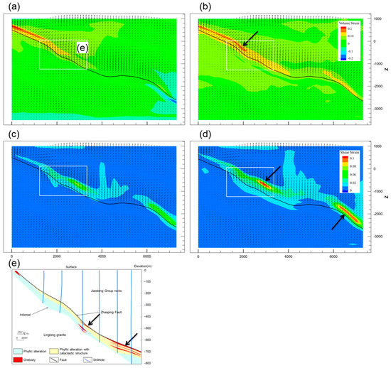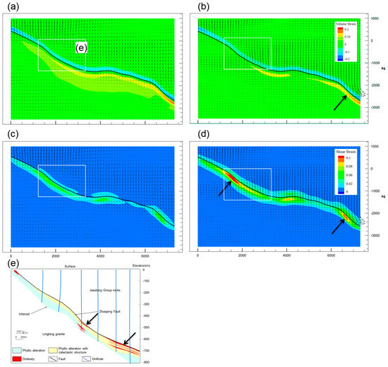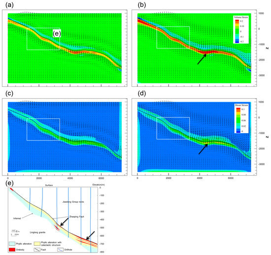 The volumetric strain, shear strain distribution, and detailed fluid flow vectors at a strain rate of 10−an s−s. In the figure, the rectangular box is the scope of the cross-sections; thick arrows indicate areas of intense strain or mineralization; the vector arrows represent the Darcy flux and are used to indicate the direction of flow. (a) 0.5% volumetric strain, (b) 1.0% volumetric strain, (c) 0.5% shear strain, (d) 1.0% shear strain, and (e) corresponding geological section.