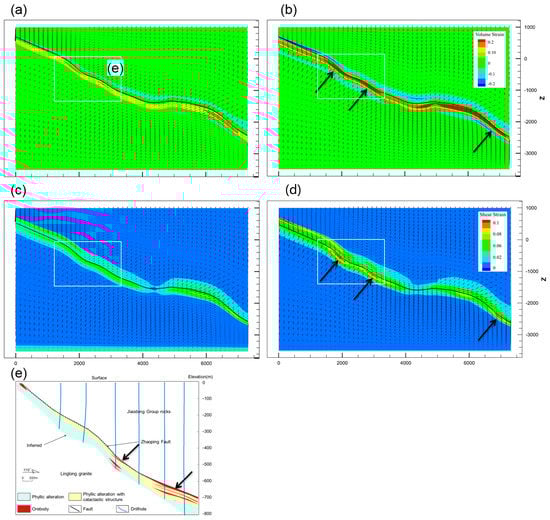 The volumetric strain, shear strain distribution, and detailed fluid flow vectors at a strain rate of 10−11 s−1. In the figure, the rectangular box is the scope of the cross-sections; thick arrows indicate areas of intense strain or mineralization; the vector arrows represent the Darcy flux and are used to indicate the direction of flow. (a) 0.5% volumetric strain, (b) 1.0% volumetric strain, (c) 0.5% shear strain, (d) 1.0% shear strain, and (e) corresponding geological section.