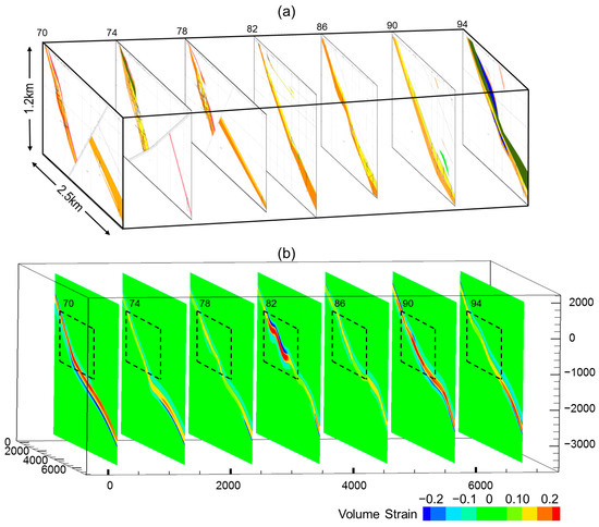 Cross-section of volume strain corresponding to exploration line with 1% bulk shortening. The rectangular box is the scope of the cross-sections. (a) Nos. 70~94 geological cross-sections; (b) cross-section of 1% bulk shortening in Model 4.