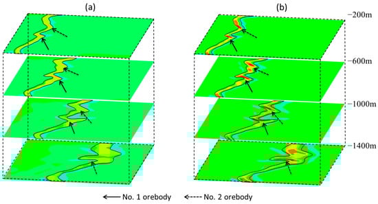 According to the cross-sections (Figure 11), the expansion deformation zone appeared at the sites with dip angles of 35°~60° in the footwall. The expansion deformation zones of section Nos. 82, 86, and 90 extended along with the NE-trending distribution from shallow to deep levels and were consistent with the distribution of the known orebodies. The fluid inflow was significant in zones with a steep fault dip angle.