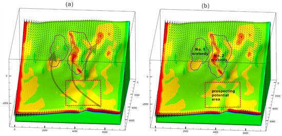 As extension progressed (1% of bulk shortening), the strains were more regularly distributed on relatively narrow and thick faults (Figure 10c,d). The distribution of the dilation deformation and fluid flow patterns in the model were consistent with the mineralization pattern (Figure 10b,d). The fault zone was a high-speed channel for conveying fluid from depths toward the surface; the maximum velocity was 5.7 × 10−5 m/yr, and the velocity decreased to 2.7 × 10−5 m/yr in locations with gentle dip.