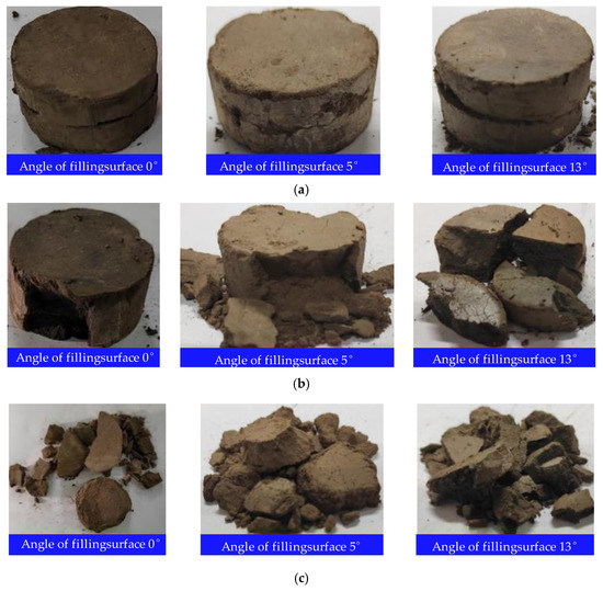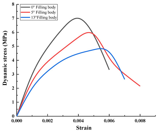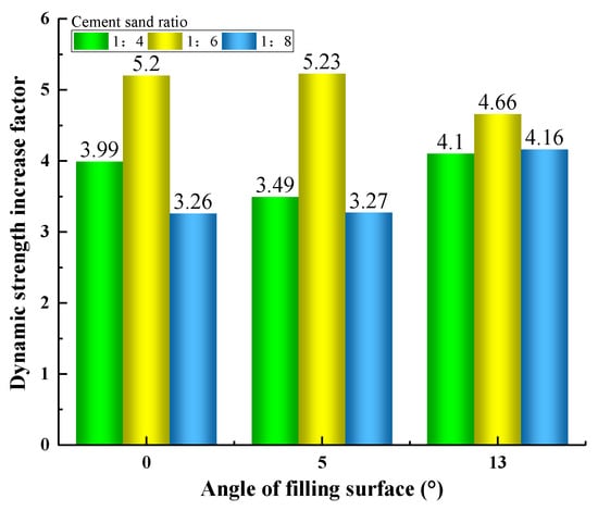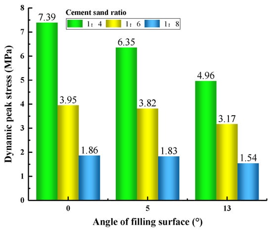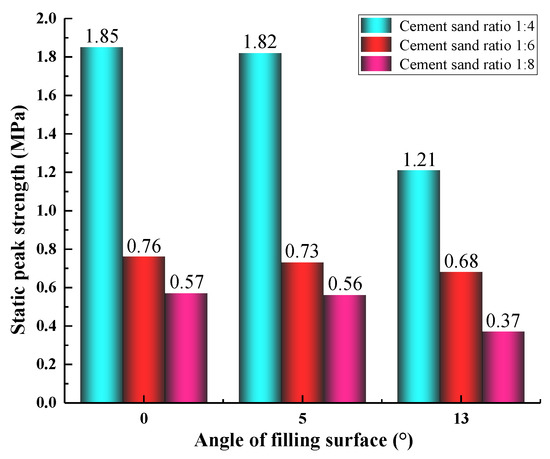 - With the increase of the stratification angle, the static and dynamic peak strength of the layered filling body decreased gradually, and the higher the cement–sand ratio, the higher the peak strength of the filling body was. There was no obvious change relating to the dynamic strength growth factor and the angle of the filling surface.