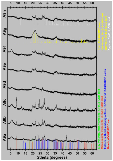 The mineralogical composition of the studied samples is presented in Table 1, while their XRD patterns are shown in Figure 2. Opal-A and opal-CT were found in five samples and its total percentage varied from 22 (sample A9h) to 85 wt% (sample A9g). According to glycolated samples, the only identified clay mineral is smectite and in particular montmorillonite (very good matching of the montmorillonte ICDD file 13-0135), with contents between 4 (sample A9g) and 45 wt% (sample A9f).