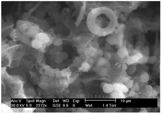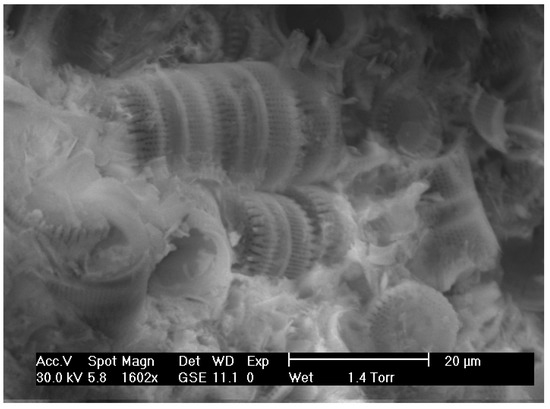 The morphological study and microanalysis of representative diatomaceous samples was performed using scanning electron microscopy on a Jeol JSM-840: a scanning electron microprobe equipped with a LINK 10,000 energy dispersion analyzer (JEOL, Tokyo, Japan). The instrument operating conditions were voltage 15 kV, electron beam intensity < 3 nA and 1 mm diameter, while the measurement time was 60 s. Corrections were made using the ZAF-4/FLS software provided by LINK. Fragments of the studied samples were sprinkled onto double-sided aluminum tape mounted on a SEM stub, carbon-coated and viewed through randomly selected fields of view.