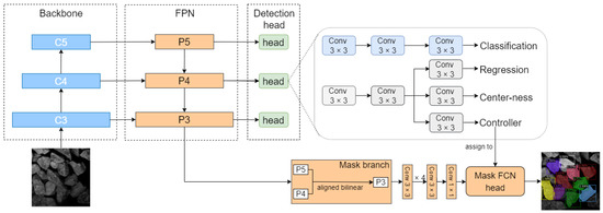 We employ the lightweight backbone MobileNetV3-small [30] to reduce computational costs. In Figure 2, the backbone can generate feature maps across different scales. High-level feature maps provide more semantic information, whereas low-level feature maps have more resolution. The features of different scales are input into the FPN [31]. The rich semantic information of the upper-layer feature maps is conveyed to the lower-layer high-resolution feature maps for fusion. After that, the fusion feature maps are input into the detection head. The detection head has the following output heads. The classification head predicts the class of the instance associated with the location. The regression head can regress the four distances of the prediction bounding boxes. The centerness head is used to suppress the low-quality detected bounding boxes. The controller head, which has the same architecture as the abovementioned classification head, is used to predict the parameters of the mask head for the instance at the location. The P3, P4, and P5 layers are translated to mask branches to obtain the results, which are convoluted and passed to the mask FCN head. The mask FCN head outputs the final results after obtaining the parameters predicted by the controller head and the information input by the mask branch.