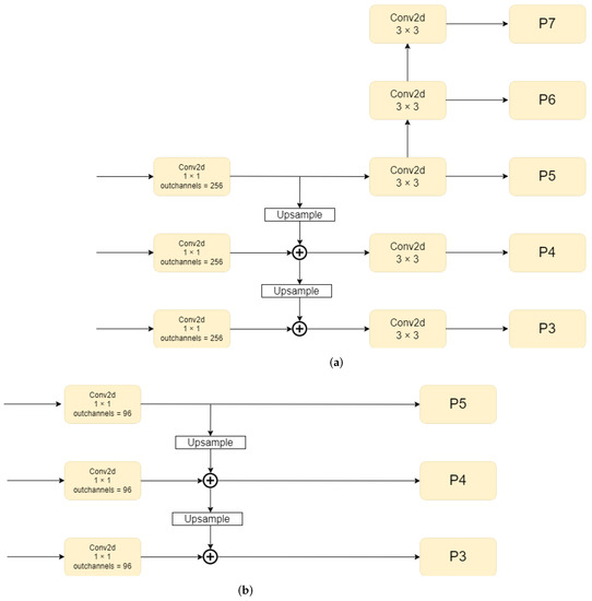 Architecture of (a) original FPN and (b) our proposed lightweight FPN. In the original FPN network, the output has five layers: P3 to P7. In our proposed lightweight FPN, C3, C4, and C5 are processed to obtain P3, P4, and P5, with a 1 × 1 convolution and an up-sampling block.