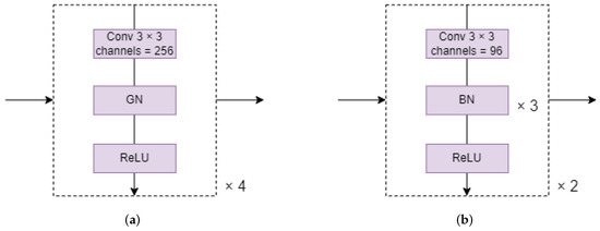 (a) Original detection head and (b) our optimized detection head. The convolution layers in the original detector head and the optimized detector head are 4 and 2, respectively, and the number of input channels are 256 and 96, respectively. The original detection head consists of a 3 × 3 convolution layer, a GN layer, and ReLU, while our optimized detection head consists of a 3 × 3 convolution layer, three BN layers, and ReLU.
